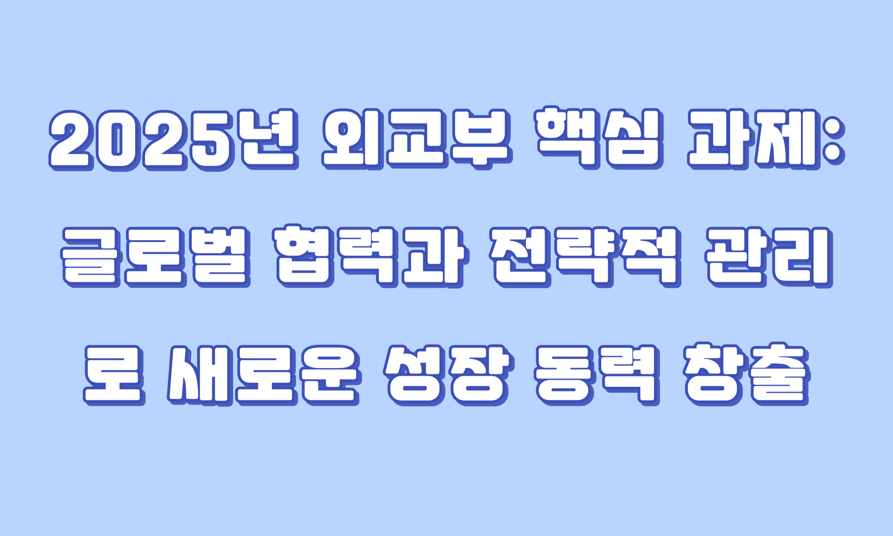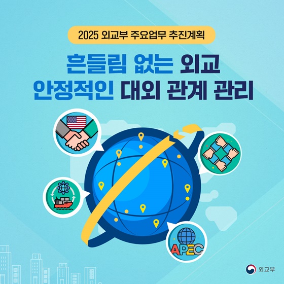 2025년 외교부의 핵심 과제는 경제, 안보, 외교 세 가지 축을 중심으로 국가의 글로벌 위상을 강화하고, 다자외교와 전략적 협력을 통해 국제사회에서 대한민국의 주도적인 역할을 더욱 확고히 하는 데 중점을 둡니다. 미국과의 경제협력 강화, 주변국과의 전략적 관계 유지, APEC 정상회의 성공적 개최, 그리고 경제안보 외교의 적극적 대응이 국가의 성장과 안보를 위한 중요한 기반이 될 것입니다.